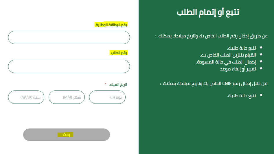 ✅ ادخال رقم الطلب أو عند عدم توفره إدخال رقم البطاقة الوطنية للتعريف الإلكترونية و تاريخ الازدياد كما هو موضح في الصورة أدناه.